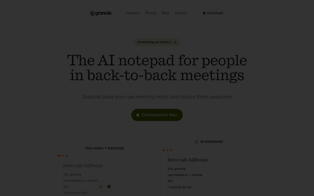 Description: Granola provides an AI notepad that turns meetings and conversations into searchable notes and summaries. Founded by Christopher Pedregal and Sam Stephenson in 2023, Granola has now raised a total of $192.3M in total equity funding and is backed by Lightspeed Venture Partners, Index Ventures, Kleiner Perkins, Spark Capital, and NFDG Ventures.