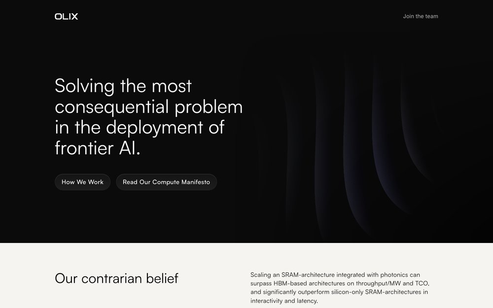 Description: OLIX designs optical AI accelerators using light-based processors to support high-performance training and inference for large AI models. Founded by James Dacombe in 2024, OLIX has now raised a total of $250.0M in total equity funding and is backed by Octopus Ventures, LocalGlobe, Entrepreneurs First, Vertex Ventures, and Crane Venture Partners.